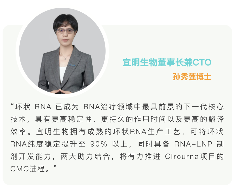 Circurna 的专有技术平台实现可编程环化、先进 RNA 工程和精准靶向递送,为传统 RNA 技术尚未覆盖的疾病打开了新的治疗空间。此次通过与宜明生物的合作,将进一步加速推进 Circurna 研发管线迈向首次人体临床试验,并构建可持续扩展的 CMC 体系以支持未来全球开发。